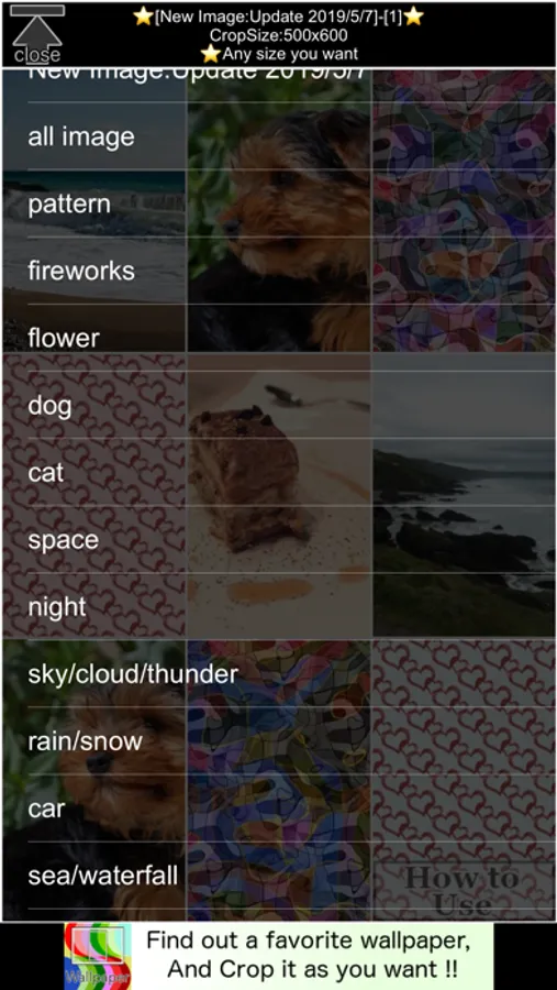 pattern image, fireworks, flowers, dogs, cats, space, night, sky/cloud/thunder, rain/snow, cars, sea/waterfall, toys, Wall/Stone/Wood, Cake/cokie, City/Road/Bridge, AirPlane/train, Hearts ,etc.