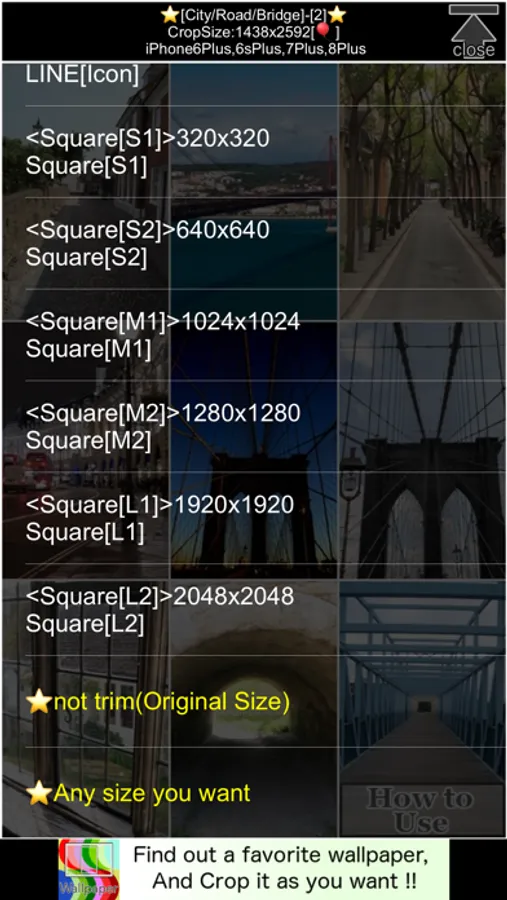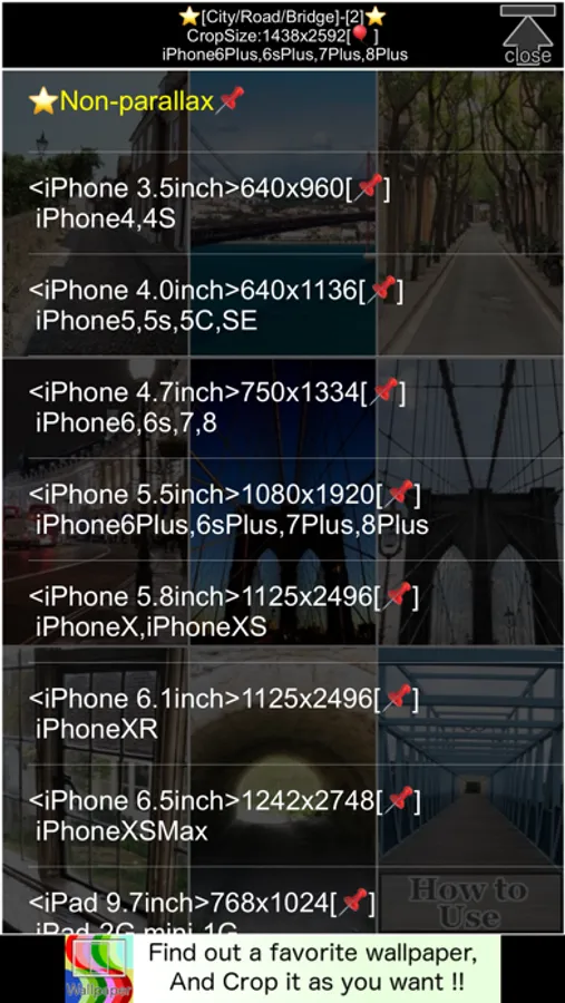 iPhone4s(1040x1360)、iPhone5または5S(1040x1536)、iPhone6または6S(890x1590)、iPhone6または6S Plus(1438x2592)、iPhone6または6S Plus L.S.(2592x2592)、iPad(1424x1424)、iPad 3またはAir~(2448x2448)、iPad mini(1424x1424)、iPad mini 2~(2448x2448)、etc..