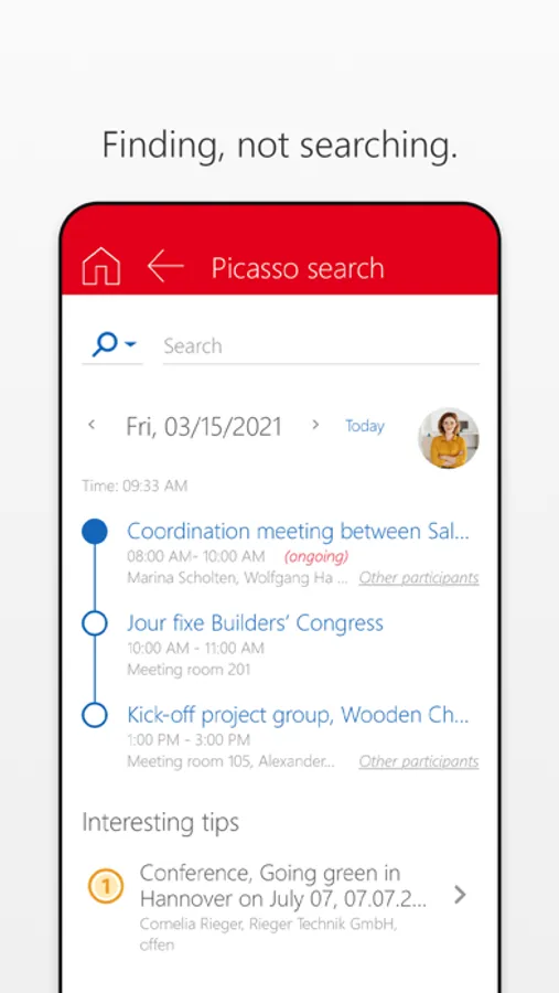The Picasso search helps you to prepare and structure upcoming events. Based on algorithms of the artificial intelligence, relevant information is individually provided. The algorithms prematurely recognize the needs of your customers and thereby create exciting customer experiences. With the Picasso search, you can see all appointments of the current day under "My day" - instantly and directly after logging on. You access contacts, documents, or the detailed appointment agenda by one touch from within the appointment.
