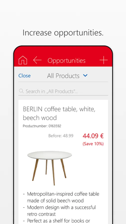 Using the new product catalog, you can start an eye-level dialog with your customers. Accompanied by images, your products are displayed as a visually appealing portfolio. You and your customers can select products and services together and thereby achieve a new transparent and clearly-structured consultancy experience. Information such as prices, quantities, and discounts of all available products are displayed in the product catalog. The desired products are adopted as product items in the opportunity. Possible scaled prices are taken into account.