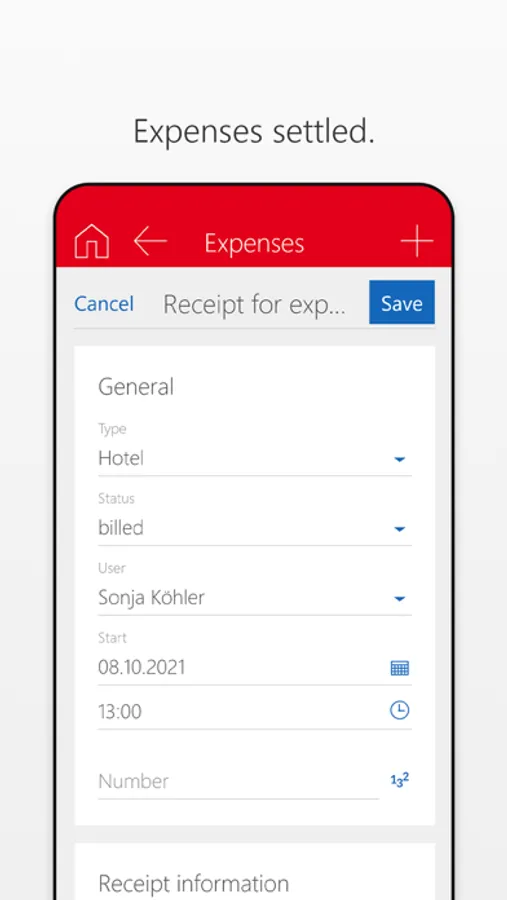 You can quickly and efficiently record and edit expenses and time records while on the go. You create receipts for expenses or travel expenses in no time - the corresponding receipt document is uploaded directly from your mobile device. Alternatively, you can create a new photo and use it as a receipt document.