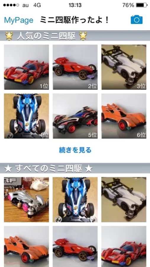 With this app, you can post and share the photos of " Mini 4WD " masterpieces you made by yourself.