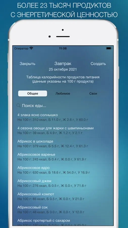 - большая база продуктов питания с энергетической ценностью (более 23 тысяч наименований) с возможностью добавления своих продуктов