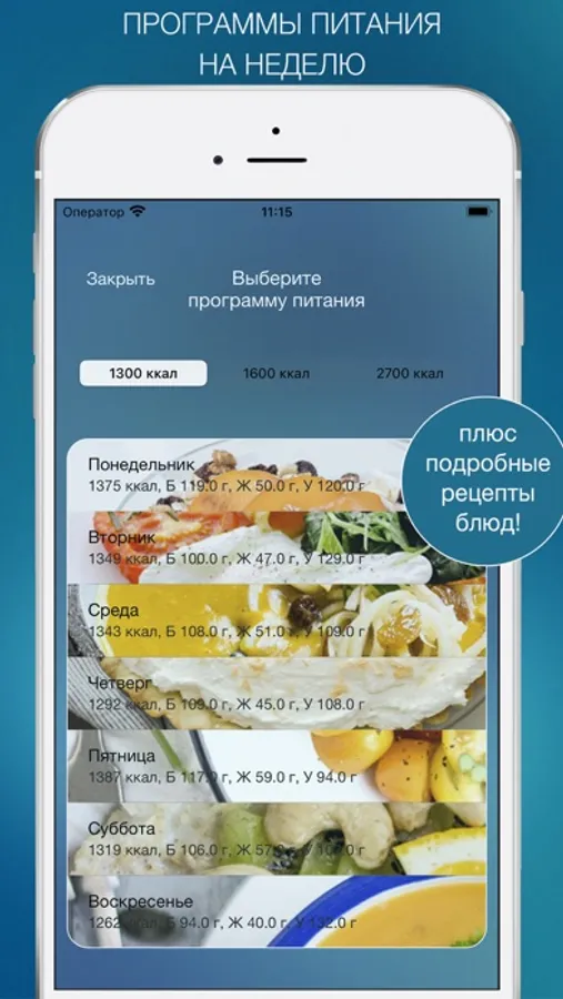 - возможность выбрать просчитанную на неделю программу питания (1300, 1600 и 2700 ккал)