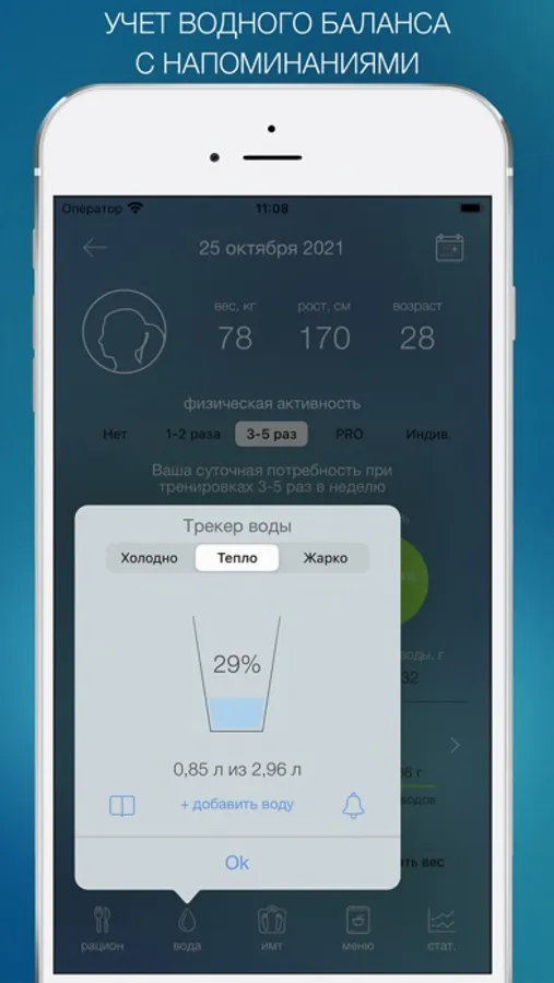 - учет водного баланса в организме (трекер воды) в зависимости от погоды (холодно, тепло, жарко)