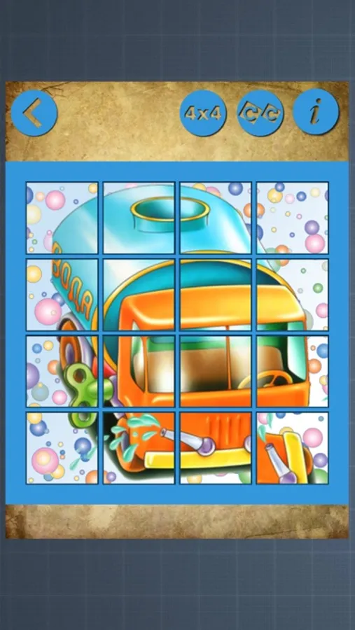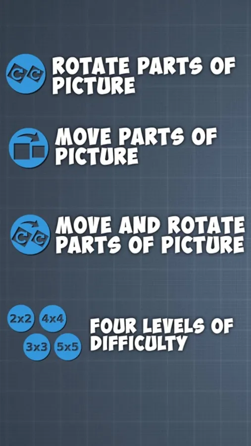 The complexity of the game increases with the number of parts into which is divided a picture. The picture may cut into 4 (2x2), 9(3x3) 16(4x4) 25(5x5) units.