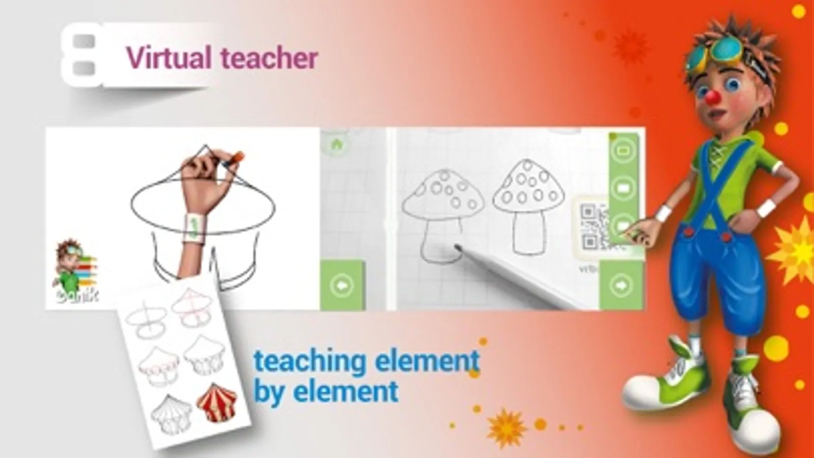 Interactive album of children's drawing lessons with an augmented reality. The program "Learning to Draw with a Virtual Teacher". Print the pages of the book with tasks, and together with your child immerse the in an exciting game in the real and virtual worlds at the same time. In the real world, the child first learns to draw simple and then complex figures, gradually mastering the basic rules of drawing. Then he points his tablet or a smartphone at the page with the completed exercise, and a virtual teacher - a cartoon character Danik appears on the screen of the device. He provides drawing education for children, explains drawing for children and gives training assignments to them, step by step teaches children how to draw figures, shows different methods of drawing, and animates the pictures.