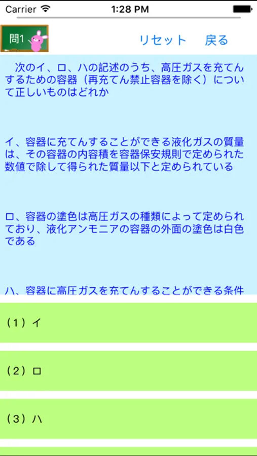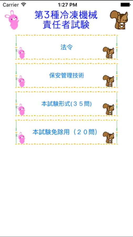 法令から20問、保安管理技術からは15問づつ出題され全35問で学習できます。また問題はその都度ランダムなため、何度でも試すことができます。