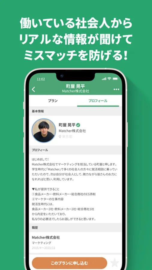 学生のうちから、様々な社会人の、様々な価値観に触れることで、自分自身の価値観を形成し、” 納得のいく職選択 “ひいては” 納得のいく人生選択 “ができる人を増やしたいという想いから、Matcherは生まれました。