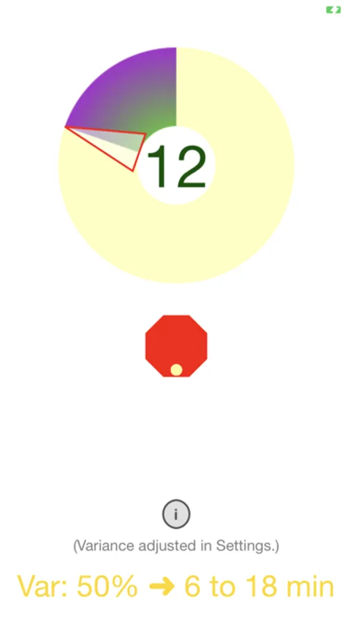 There is a message displayed at the bottom of the screen that describes what the variance calculation will be, given the settings that you have chosen; for example, if you set the timer for 30 minutes, and the variance to 50%, then the message will say, “Var: 50% = 15 to 45 min.” That means that when you start the timer, the arrow will jump to a point between 15 and 45 minutes before it begins to count down. (You can choose to hide that message.)
