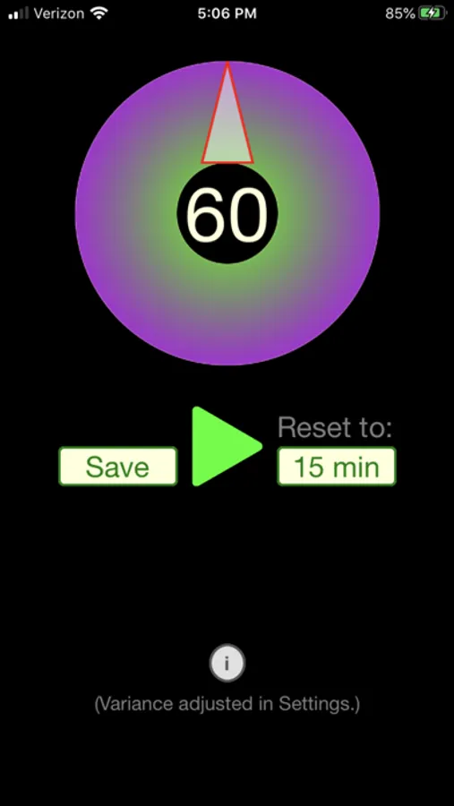 Tap the green Start arrow to begin the countdown and display the Stop button (i.e., the red stop sign). If no variance is set, the arrow will immediately start to move as the time decreases (in intervals of one second). If a variance amount is set, then the arrow will jump to a (constrained) random starting point before counting down. When the timer is done counting down, up to three types of alarms will go off (depending on your Settings). All alarms will cease when you tap the Stop button (which in turn displays the Start button, as well as the Save/Reset buttons).