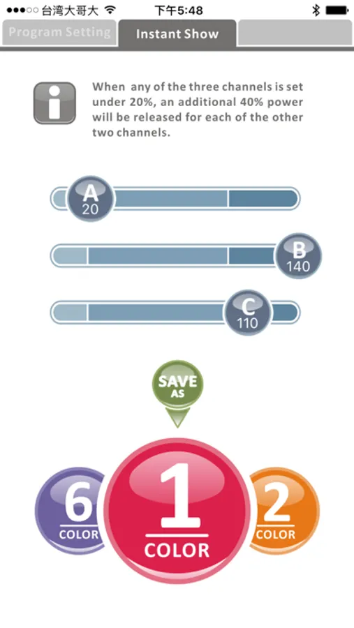 Illumagic imOS CRX is a light controlling interface which allows you to program and control the LEDs within the ComboRay series G2 and X series via Bluetooth of your mobile devices. You can define the intensities of LEDs within three channels at various time points that you can also define by yourself. You can let the light settings of two adjacent time points to change gradually or instantly according to your need. There are also various lighting modes to be programmed and selected so you can change the light settings according to your favors.