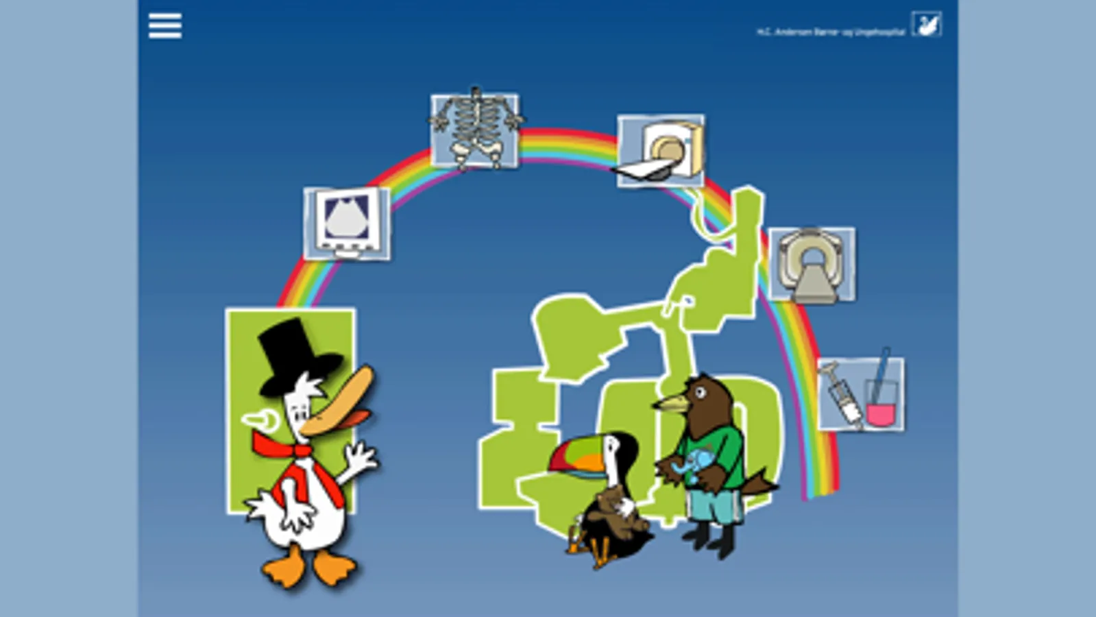 "HC And - Røntgenafdelingen" er en introduktion til fem generelle patientforløb. Informationen er med speak - af en barnestemme - og animation i genren ”Læring gennem leg med tablet/mobiltelefon/touch-skærm”.