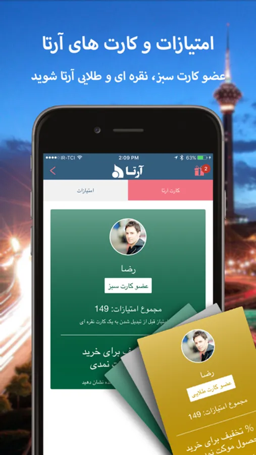 با عضويت در اين اپليكيشن و كسب امتيازات و با دريافت كارت های (سبز، نقره ای و طلایی) آرتا ميتوانيد از تخفيفات ويژه محصولات آرتا و جوايز ارزنده آن بهره مند شويد.