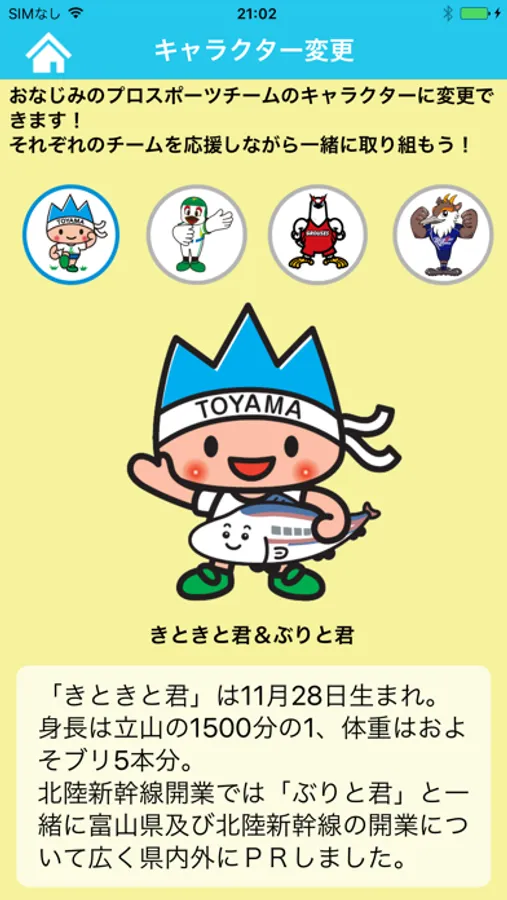 富山県のマスコットキャラクター「きときと君」のほか、富山を代表するプロスポーツチームのマスコットキャラクターを選択できます。