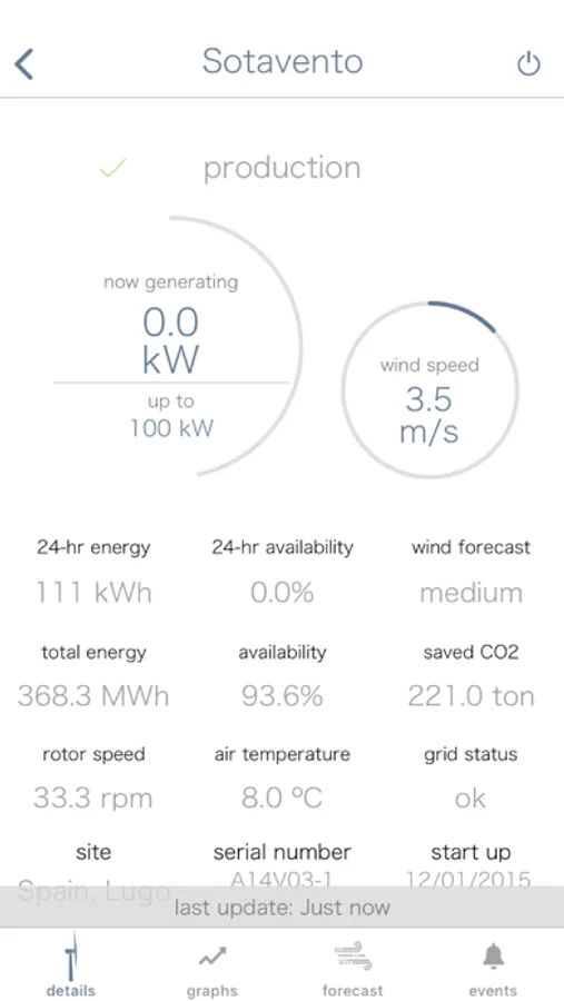 - Keep track the wind, power, energy your turbine is currently producing and its