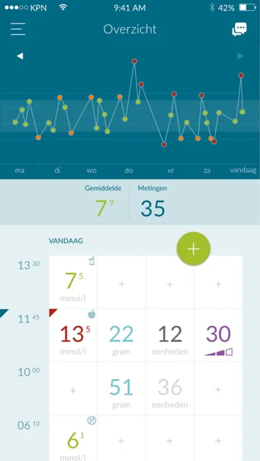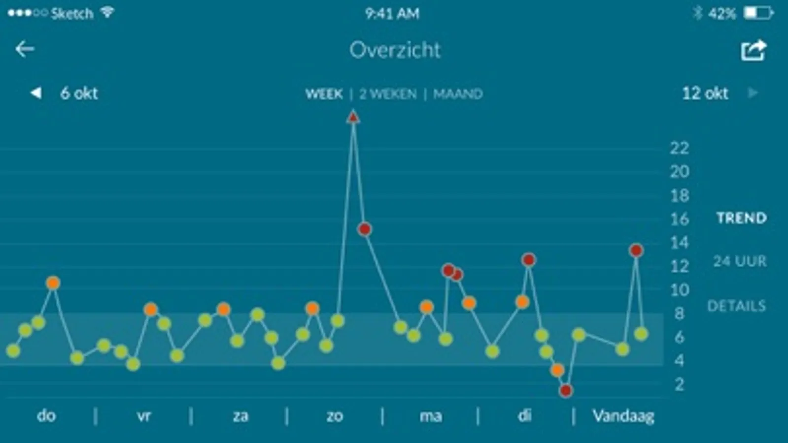 Blood glucose levels can be extracted automatically from medical devices using Bluetooth. Other data can be added manually. The DiaCare app provides clean insight in this data through graphs and overviews. DiaCare provides you with this insight anytime, anywhere!