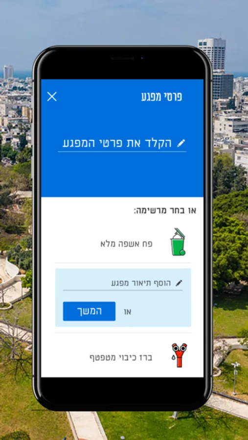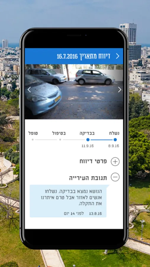 האפליקציה מאפשרת לדווח על מפגעים בזמן אמת בפשוטת ובנוחות ולקבל סטאטוס על הטיפול במפגע בזמן אמת.