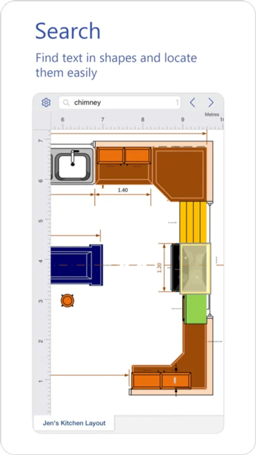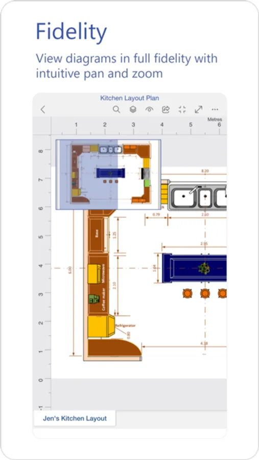 Visio diagrams look great on your iPhone, all along with an intuitive pan and zoom experience optimized for touch. Additionally, you can easily find information on the diagram through Find and reveal different visualizations of the same diagram using Layer wherever you are, in the office or on the go.