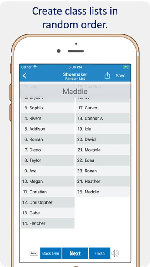 Random List displays your class list in random order. Need a better system for picking the next student to take down the attendance, or to choose a birthday donut? Random List is the answer. Create, save, and export random lists for just about anything.