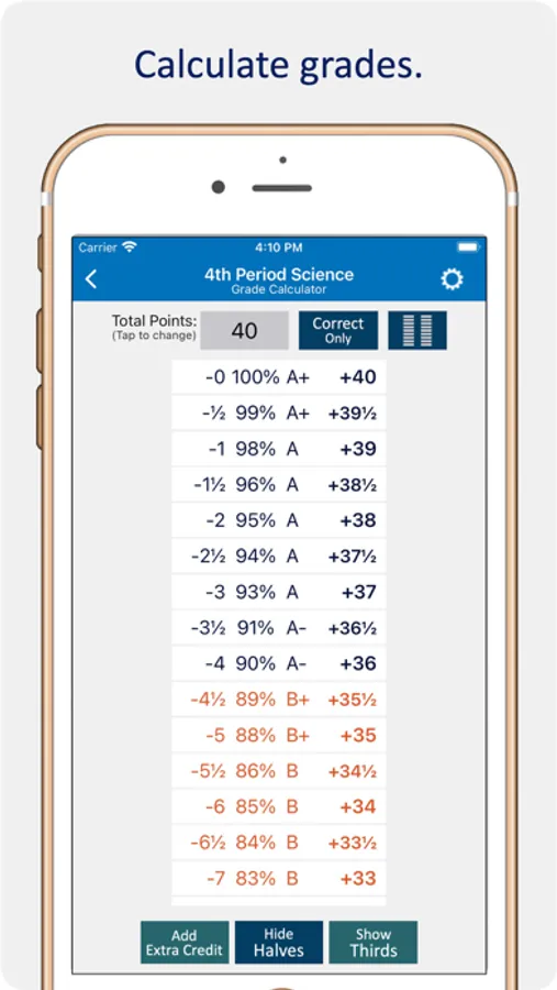 Utilize Grade Calculator to quickly determine final grades for test, quizzes, and other assignments. Calculate percentages and determine letter grades for a traditional grading system, or point averages and average performance levels for a rubric-based system. You can customize the output to include halves and/or thirds as well as extra credit points.