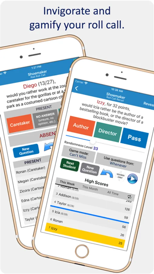 Invigorate your daily attendance with Rad Roll Call! Start each day by choosing one of over 200 Rad Roll Call questions. Students confirm they are present by responding to the question. Their answers (as well as the day's attendance) are saved and used for the Roll Call Recall game, where students earn points for remembering their classmates' responses.