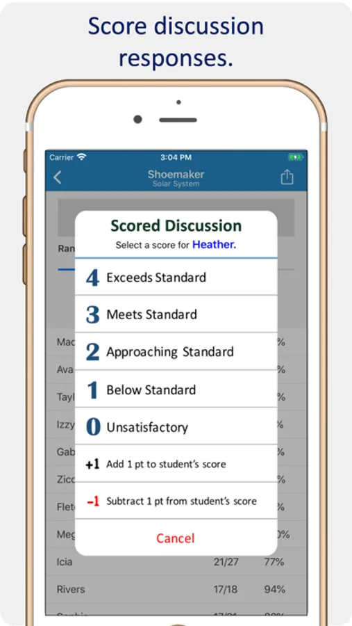 Use Scored Discussion to track student responses during discussions. Just tap on a score as students give answers. Popsicle Sticks will display a running total for each student and automatically save the scores for future discussions. You can select students randomly (of course) or manually (by just tapping on a name). Save multiple discussions for various subjects, and easily export the scores to Excel or another application.