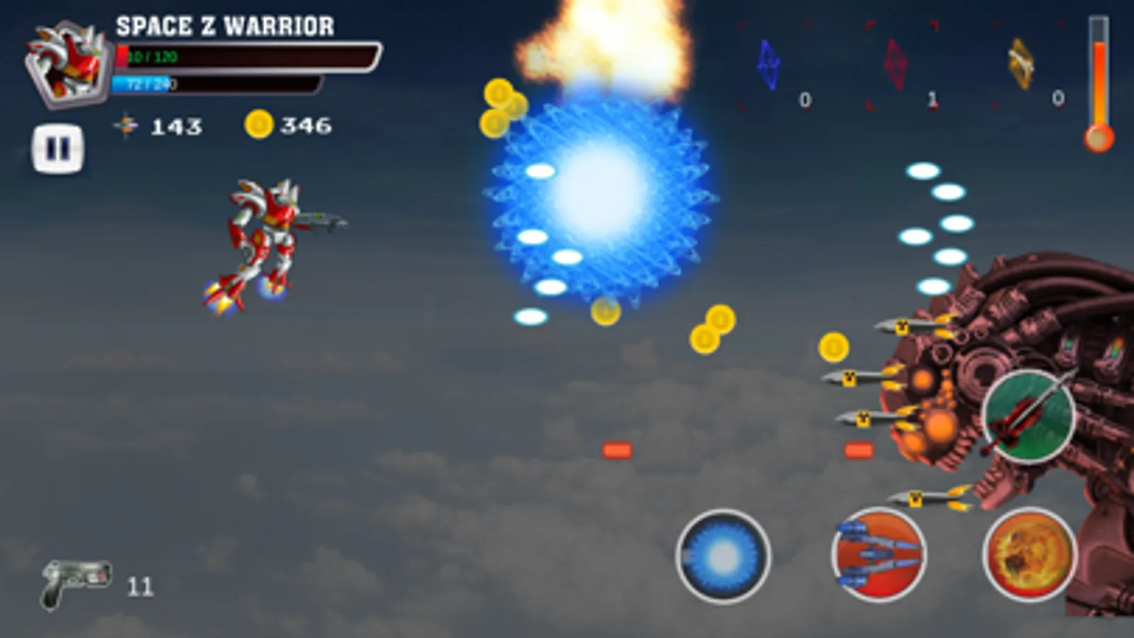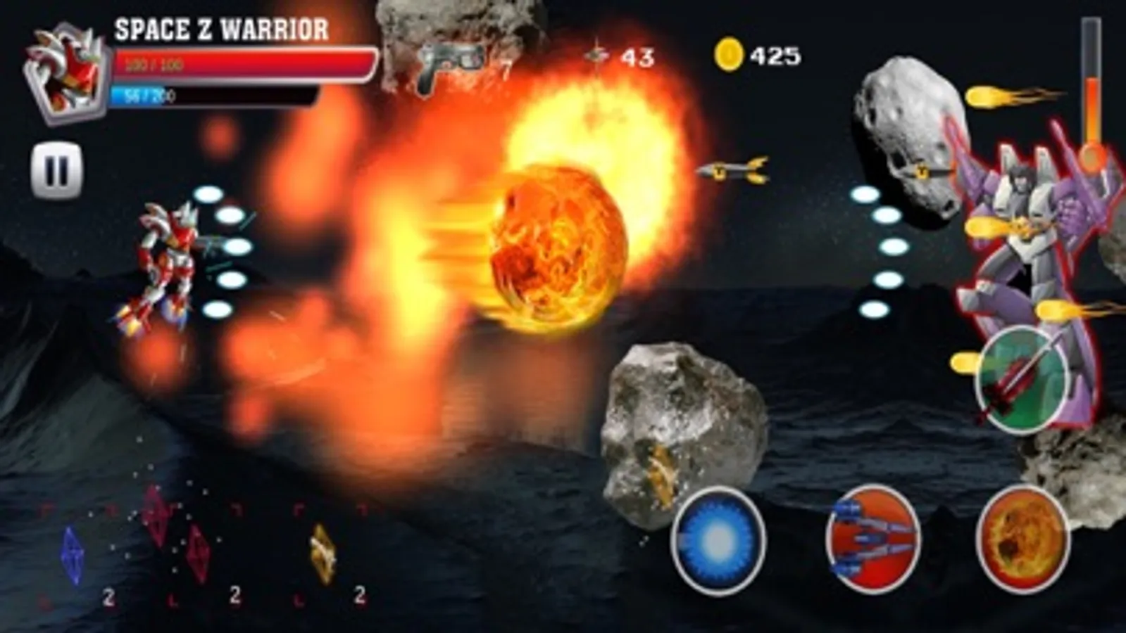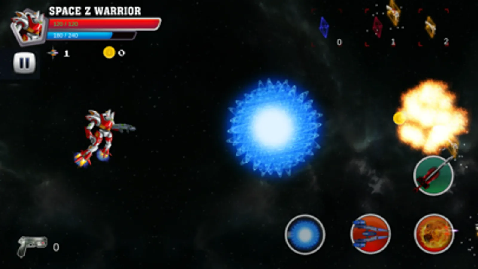 Our games require you use 2 fingers at least to play the game, left finger will control the robot fly and the right finger will touch to use super skills in right corner. Each super skill need to spend a number of power in power line and you can’t fire the super skill if not enough power.