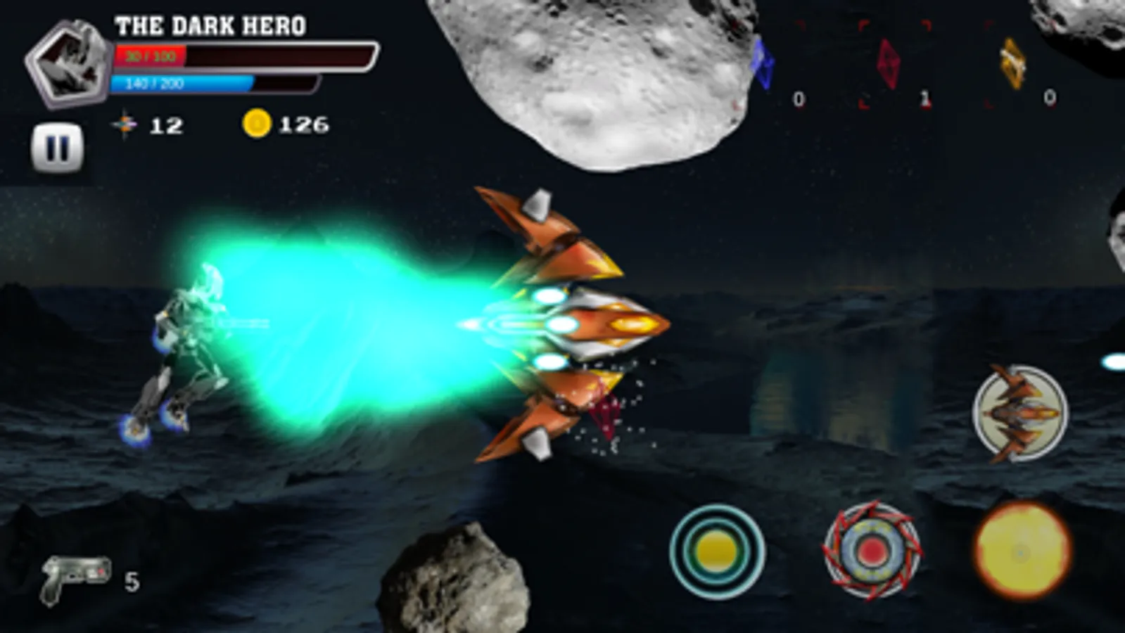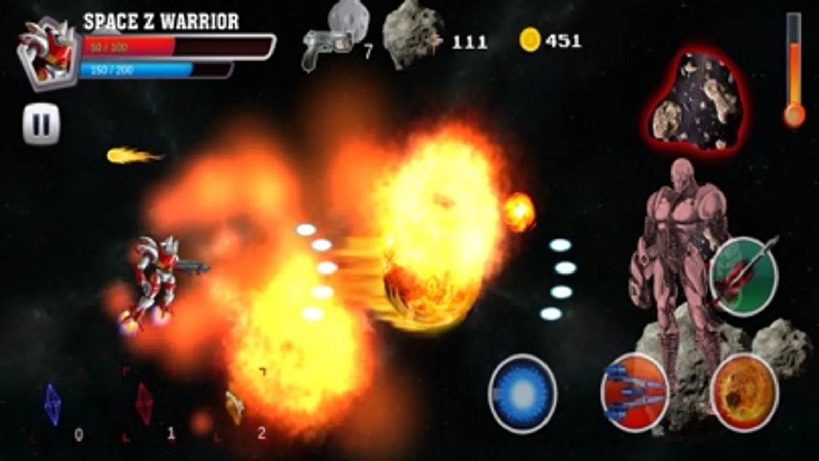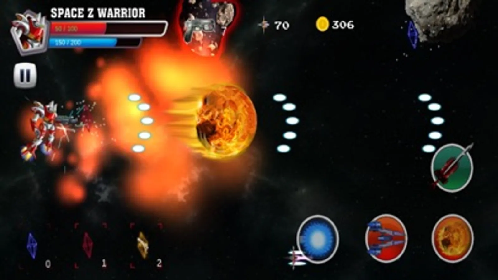 Our games require you use 2 fingers at least to play the game, left finger will control the robot fly and the right finger will touch to use super skills in right corner. Each super skill need to spend a number of power in power line and you can’t fire the super skill if not enough power.