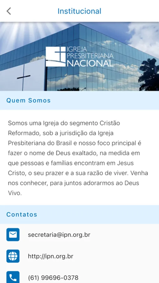 A Igreja Presbiteriana Nacional, sediada em Brasília desde a fundação da Capital Federal em 1960, tem um compromisso com a Bíblia Sagrada, como regra de fé e de prática, adotando os Padrões de Westminster (Confissão de Fé, Breve Catecismo e Catecismo Maior) como exposição fiel dos temas abordados nas Escrituras. A IPN é jurisdicionada pela Igreja Presbiteriana do Brasil.