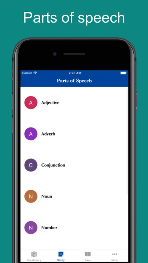 - Adjective, Adverb, Conjunction, Noun, Number, Preposition, Pronoun, Verb