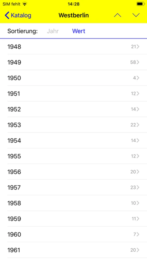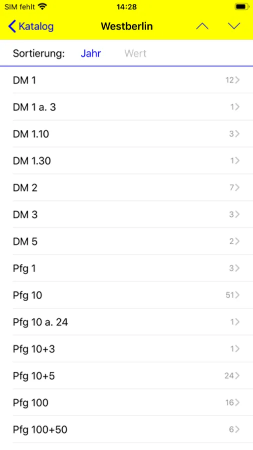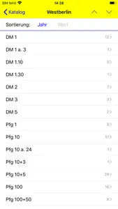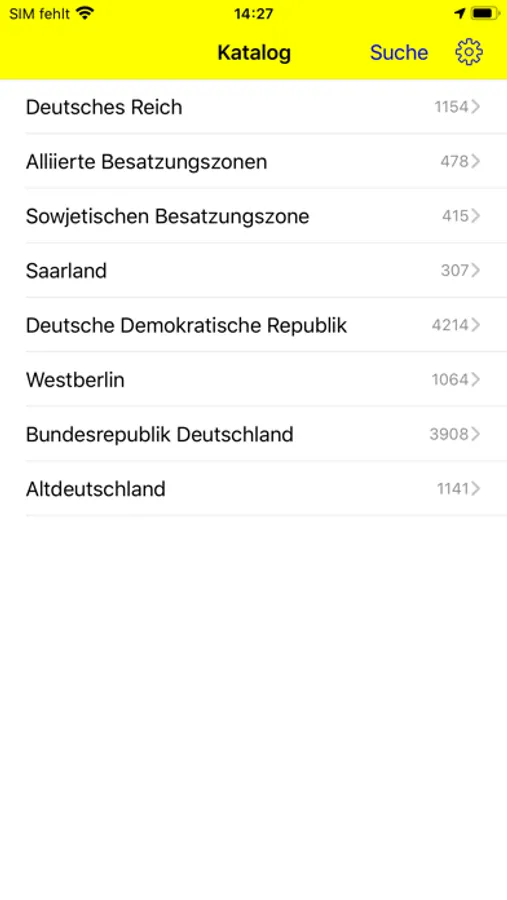 Die Katalogübersicht ist gegliedert in Sammelgebiet, dann nach Jahr oder Wert(stufe). Es wird die Trefferzahl angezeigt. Nach einem Klick auf einen Eintrag erscheint die Liste (kann etwas dauern). Ein Klick auf eine Bezeichnung neben dem Bild wird die Suche mit der Bezeichnung gestartet.