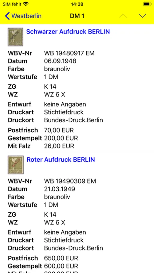 Du siehst zu den Briefmarken ein Bild, Details und Katalogwerte. Alle Details für alle Sammelgebiete sind nur im Abo sichtbar. Kostenlos siehst du alle Marken mit Bild und alle Details der Marken zu den Sammelgebieten Westberlin und Westzonen.