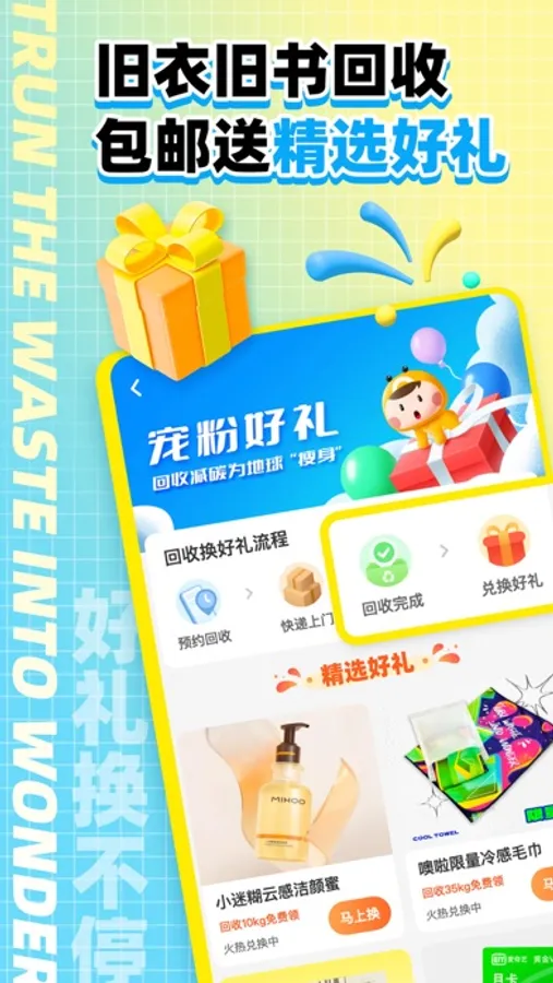 【回收换购礼品】:回收旧衣订单完成满足重量要求,即可免费兑换精选好物包邮送到家。