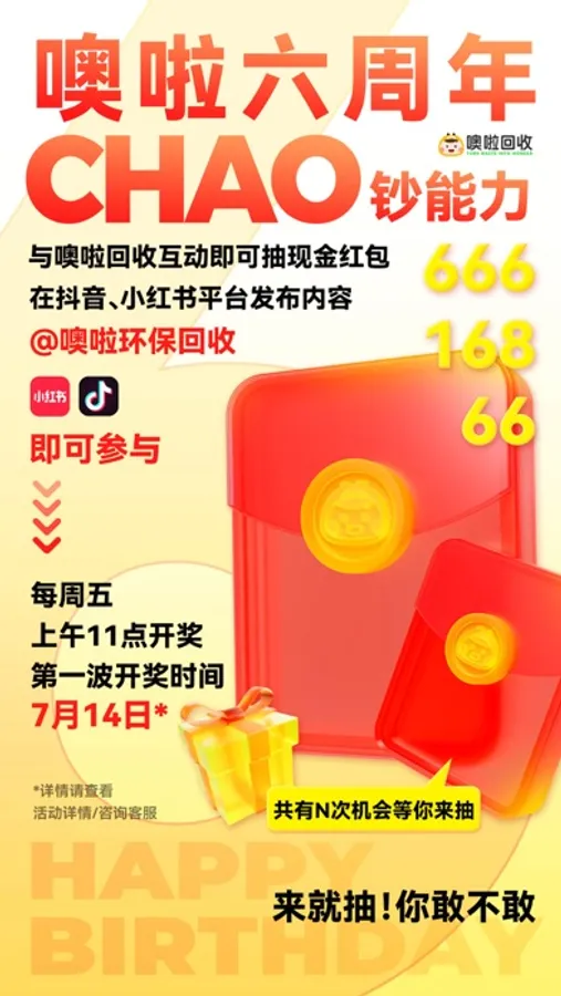 上小红书或抖音参与回收晒单,每周抽2名用户赠最高666元红包,每周五上午开奖;