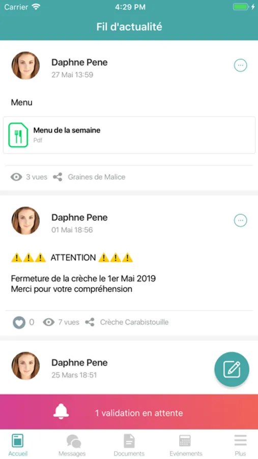 Les parents peuvent retrouver différents contenus postés par les professionnels : anecdotes, menus, rendez-vous de l’année, photos de leur(s) enfant(s) et même des informations pédagogiques qui leur permettront de mieux appréhender l’univers de la crèche et de l’enfance.