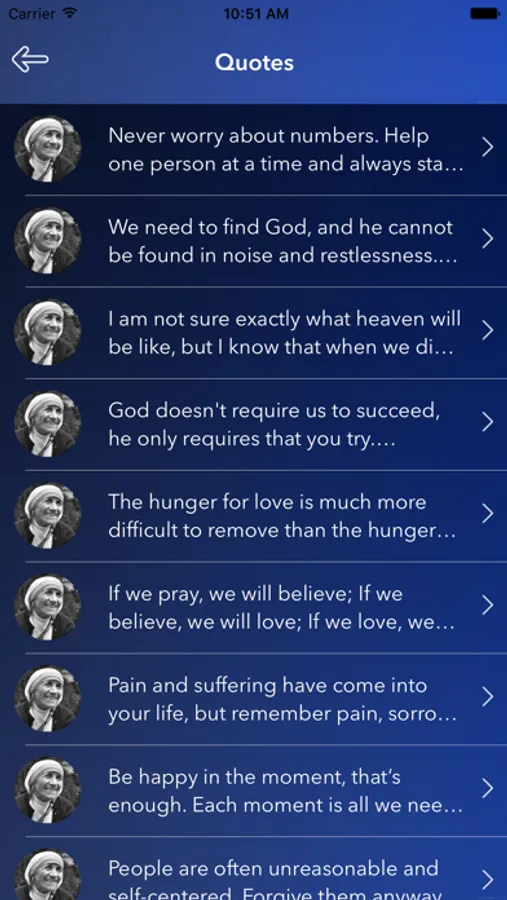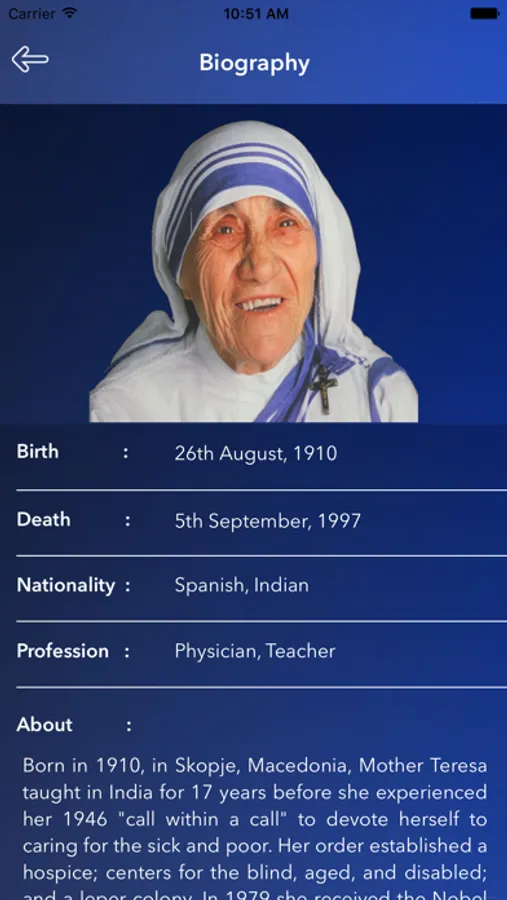 This application has a complete collection of Mother Teresa quotes. It features all of is best quotes which can truly inspire any human across the globe.