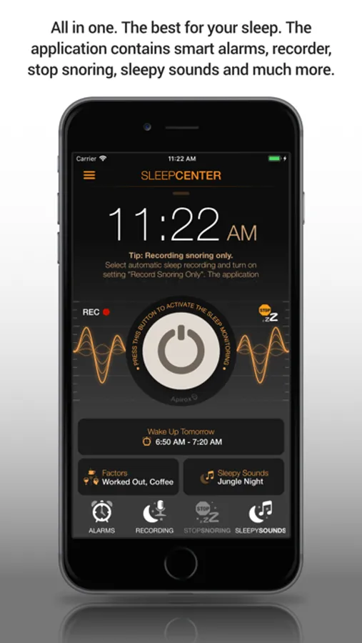 The Sleep Center is a superior all-in-one sleep application. It consists of four modules: RECORDER, SMART ALARM, STOP SNORING, SLEEPY SOUNDS.