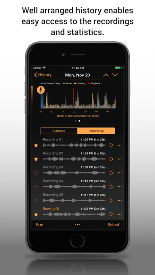 Tries to stop your snoring by playing chosen sound or using iPhone vibration when the snoring is detected.