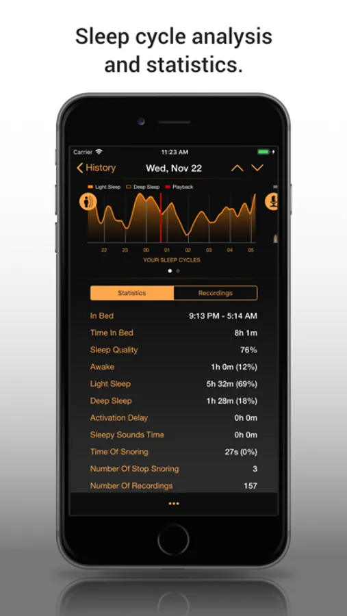 Sleep cycle analyzes and statistics with complete history and beautiful charts.