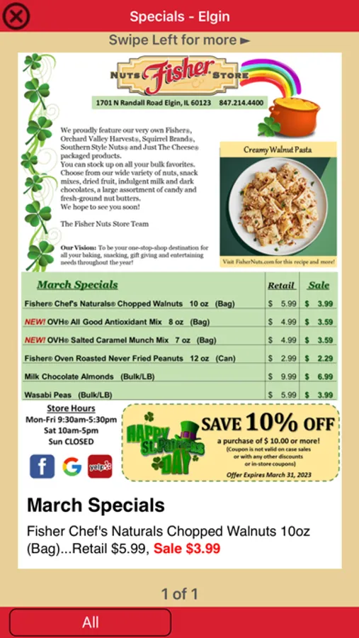 The App is FREE, offers are paperless, specials are super – sort of like an outlet at your fingertips – from your friends at Fisher Nuts Store in Elgin.