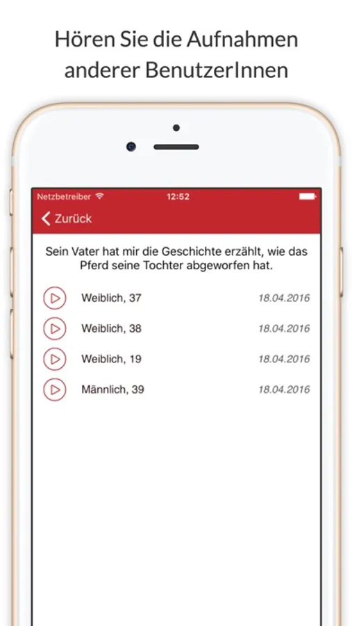 Nehmen Sie Ihr eigenes regionales Deutsch auf und hören Sie die Aussprachen anderer BenutzerInnen von ‘Deutschklang’ an. Sprechen Sie so, wie Sie mit Ihren Freunden aus Ihrem Herkunftsort entspannt sprechen würden.