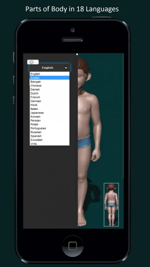 Users can change the selected language via settings. App will start voicing the parts of body name as well as showing the name of tapped part of body in that language.