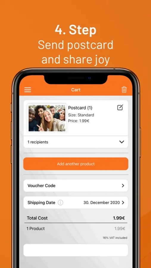 You decide yourself how your message should be designed on the postcard. Choose a format and use your own pictures.