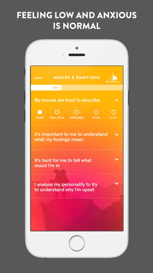 MoodMission is based in cognitive behavioural therapy (CBT), which is an evidence-based psychological therapy for anxiety and depression. Anyone can use MoodMission, whether you just want a lift in your day or need a bit more help recovering from anxiety or depression.