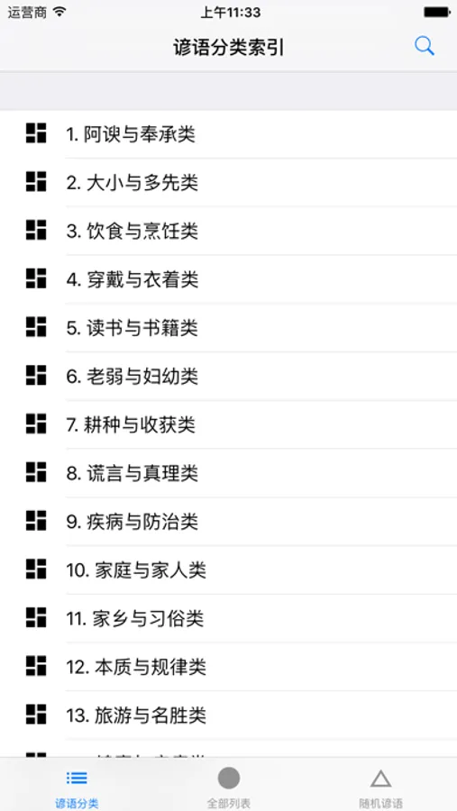 ·分类功能,用户可以根据“谎言与真理类”、“耕种与收获类”、“勤俭与节约类”等80余个分类检索谚语内容