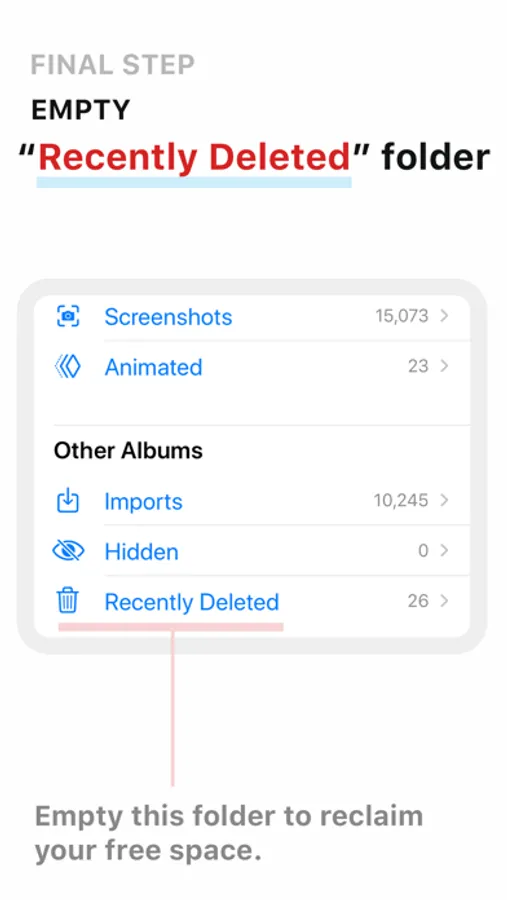 Note: to permanently delete photos from your phone, you will need to do an extra step. Go to “Recently Deleted” section in Photos app and choose “Delete All”.