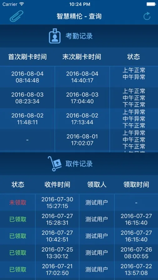 智慧精伦依托于精伦电子智能园区信息化平台,实现员工月度考勤记录和日常快件收发查询。
