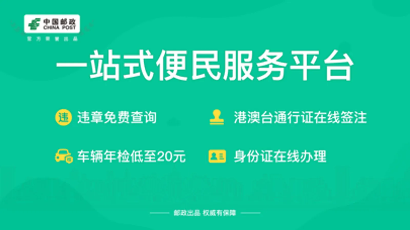 邮证APP提供广东港澳签注、EMS揽收,赴台签注、机动车号牌邮寄办理、全国交通违章查询办理、车辆年检、驾照查分等服务,是一个高效、安全、便捷的便民服务平台。