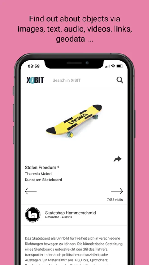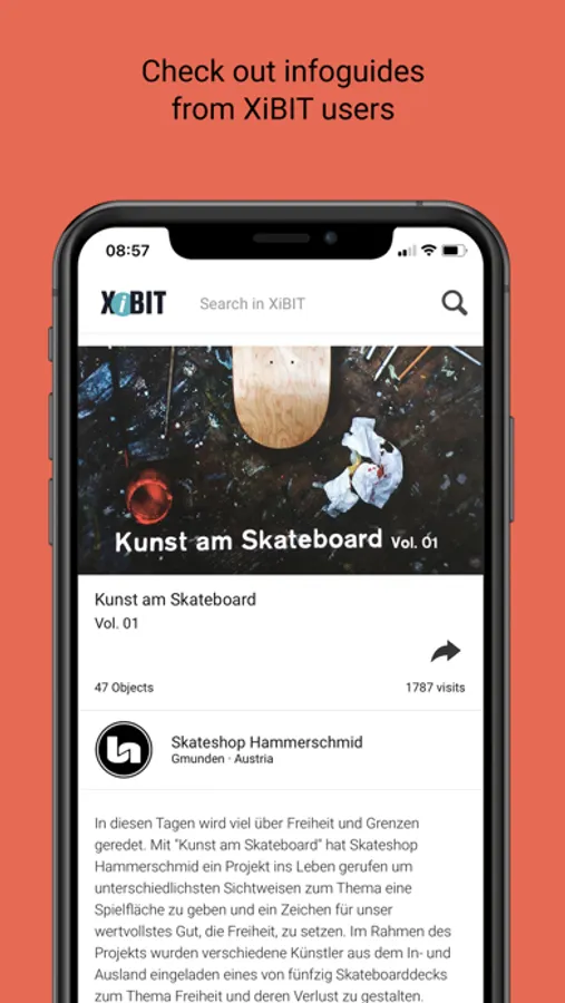 The XiBIT app turns your smartphone into an information guide: Find out about objects in museums and other showrooms, listen to audiocommentaries and visit points of interest on your trip. Watch infoguides from XiBIT users, who can describe objects with images, text, audio, videos, links and geodata under www.xibit.info. The app combines a search function, maps for finding near content, a numpad and a QR code scanner for recalling objects directly. Find out about exciting things via a map which shows profiles around you.